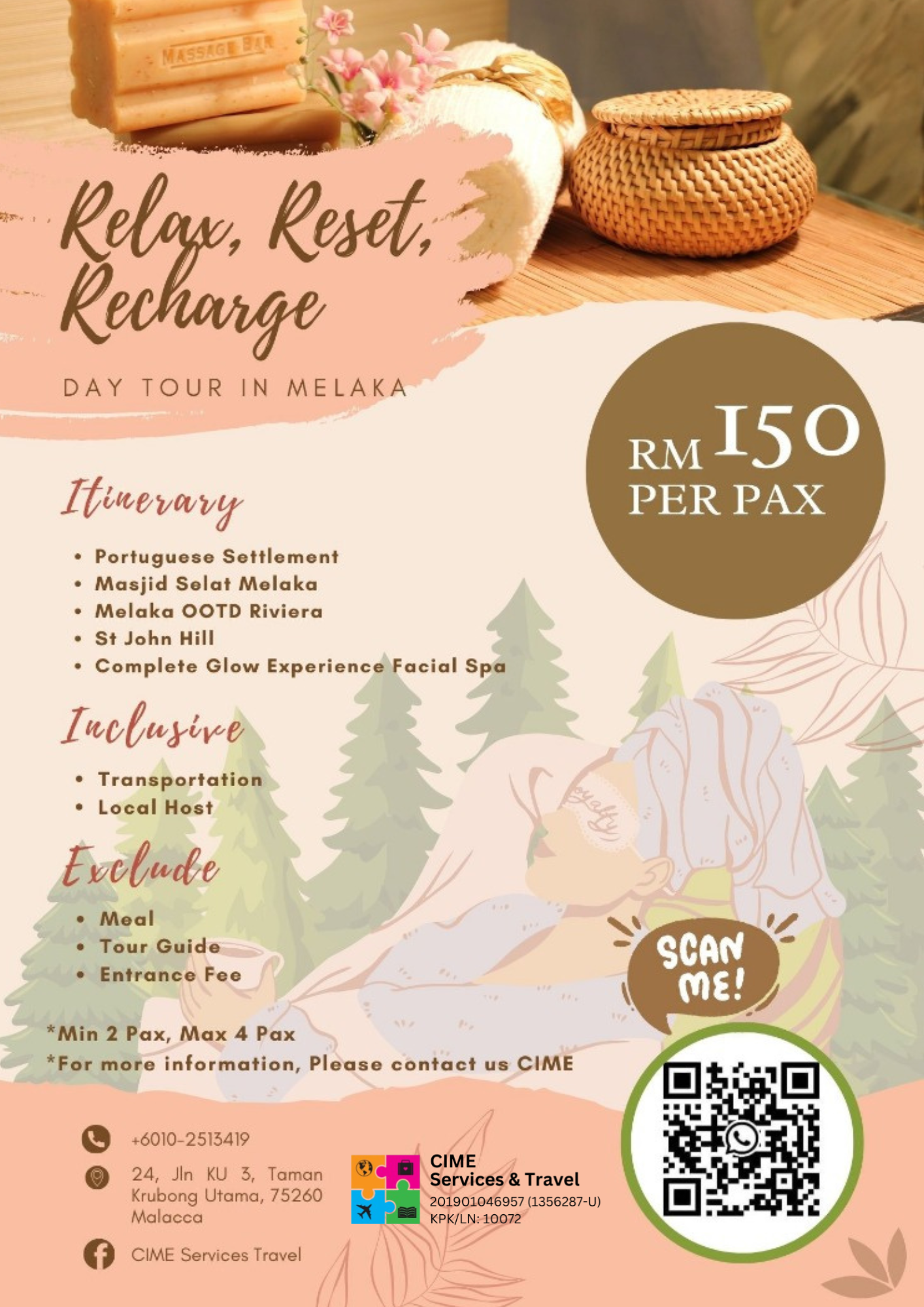 Join our Relax, Reset, Recharge package — a perfect one-day getaway to unwind and explore the beauty of Melaka!